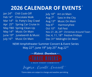 The frigid temperatures and snow are making us really look forward to our 2026 events! Downtown Three Rivers will be hosting at least one event each month this year. Find the current list of events in the image below.