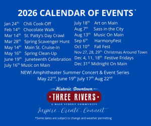 Downtown Three Rivers will be hosting at least one event each month this year! Find the current list of events in the image below.